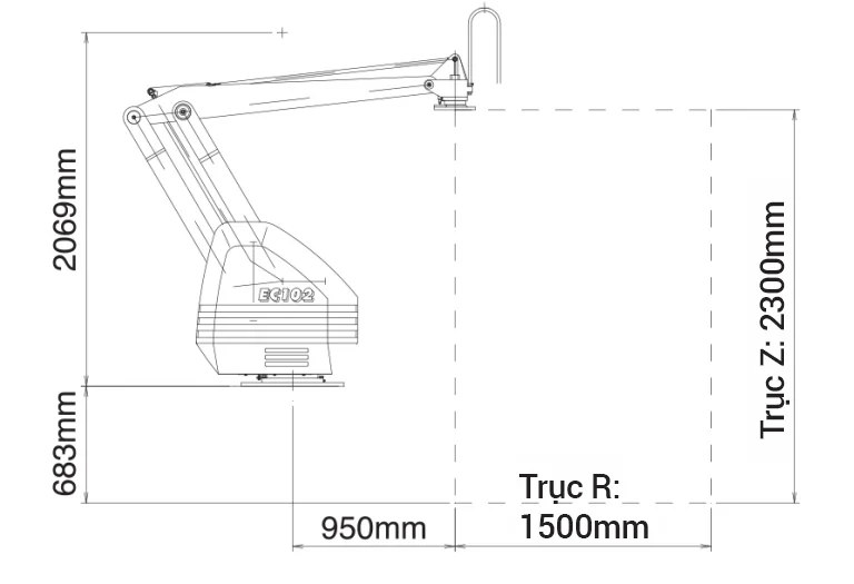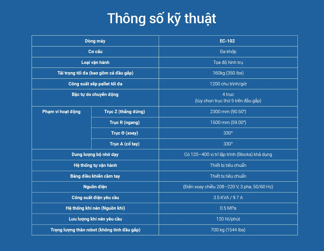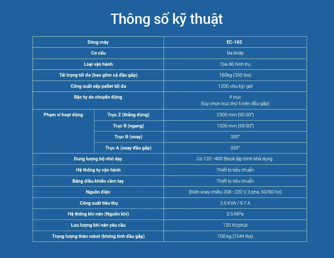 Robot hiệu quả nhất của chúng tôi, EC-102, được thiết kế cho các dây chuyền sản xuất có tốc độ đầu ra từ thấp đến trung bình và không gian hạn chế.