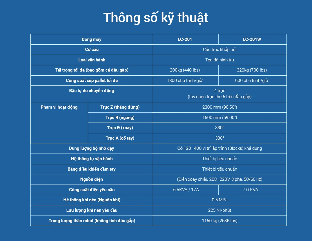 Robot EC-201 được công nhận là một trong những sản phẩm nổi bật nhất của dòng FUJI-ACE. Đây là dòng hiệu quả nhất trong việc xếp hàng lên pallet và được trang bị công nghệ tiên tiến nhất. EC-201 được khuyến nghị sử dụng cho các nhiệm vụ như đóng gói hàng vào bao hoặc thùng carton đựng đồ uống.